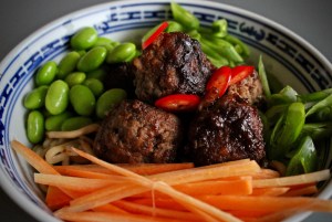 Nudler med friske grønnsaker og kjøttboller