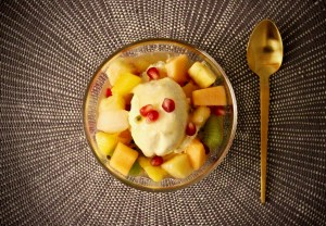 fruktsalat med iskrem ovenfra